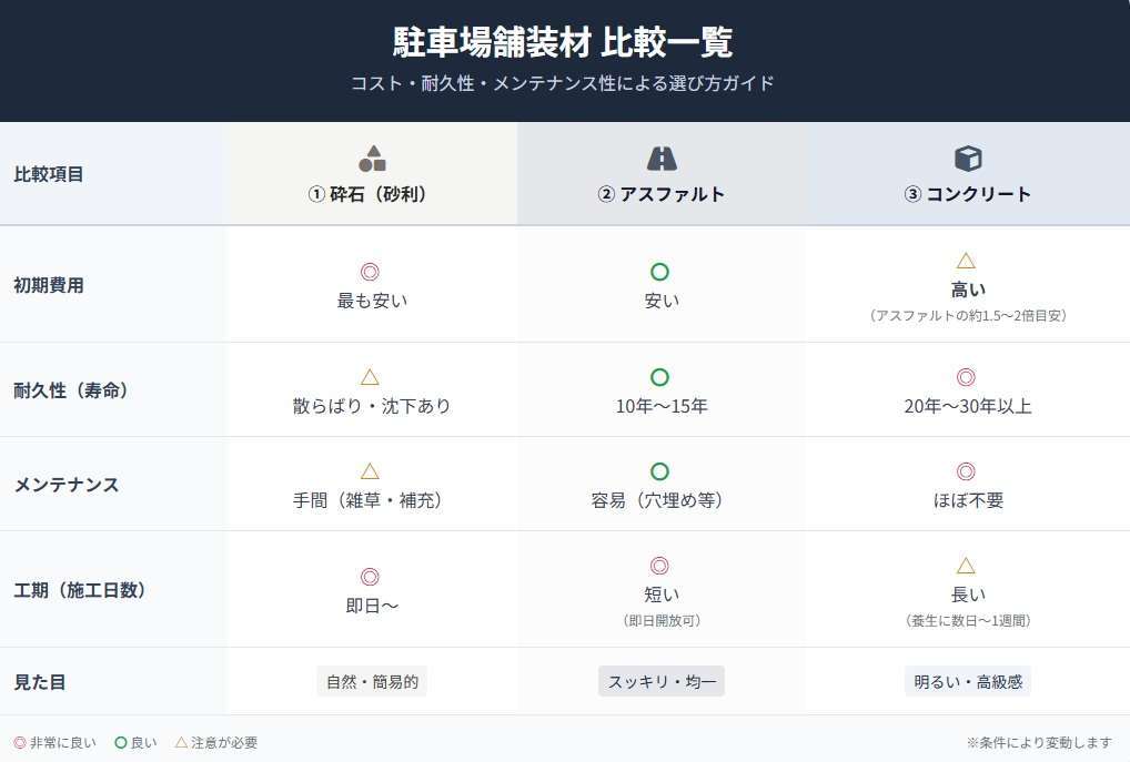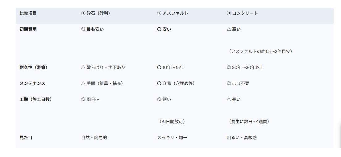 ここまで各舗装の特徴を見てきましたが、「結局、うちにはどれがいいの?」と迷われている方も多いでしょう。 そこで、「アスファルト」「コンクリート」「砕石(砂利)」の3大工法を、お客様が最も気にされる3つの軸で横並びに比較しました。